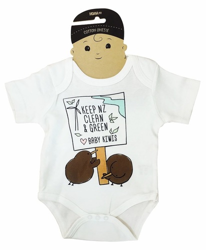 Sweet little off-white onesie with the image reading "Keep NZ clean & green Baby Kiwis"