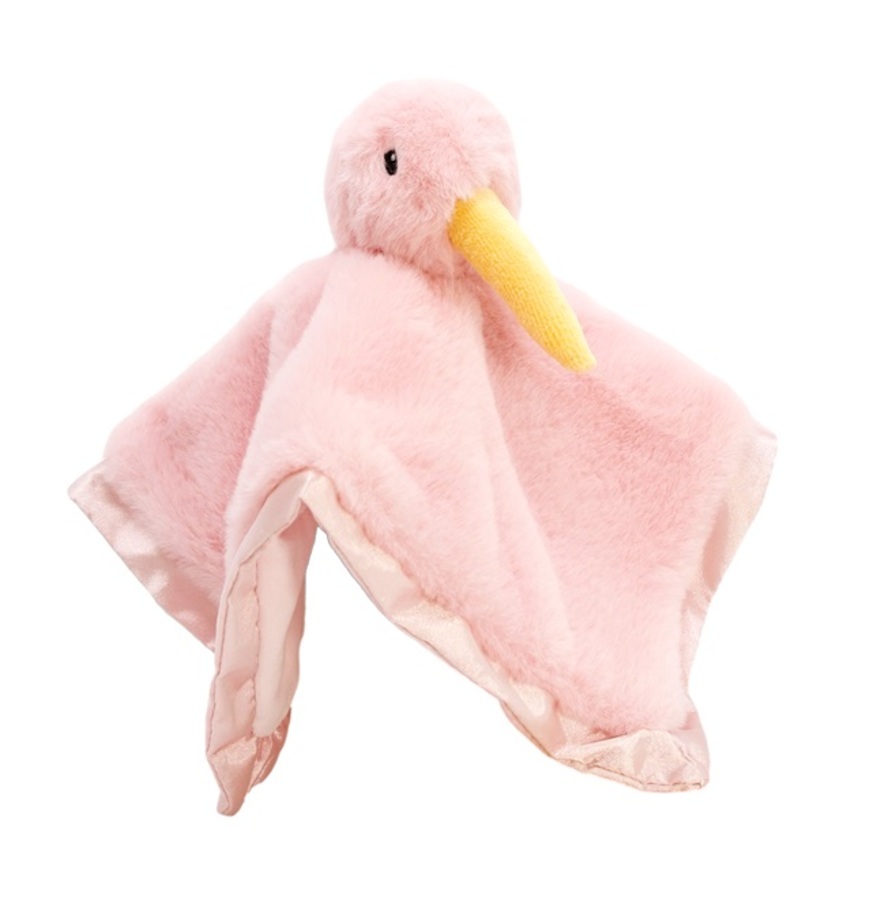 This snuggly dou dou comforter features baby-safe embroidered eyes on the kiwi's head, two differently textured plush fabrics, and a satin trim.