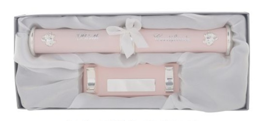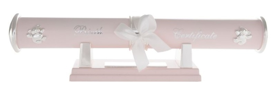 Sure to become a keepsake to be treasured, this pale pink birth certificate holder features two happy teddy bears and 2 places for names and dates to be engraved, plus one more on the base! The holder pulls apart in the centre, revealing a hollow tube for you to roll up the birth certificate and stash it safely inside.