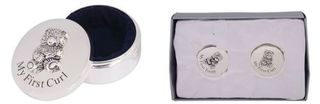 Set of two - each with a cute bear embossed on the lid and the words, "My First Curl" and "My First Tooth." Lined with blue velvet.